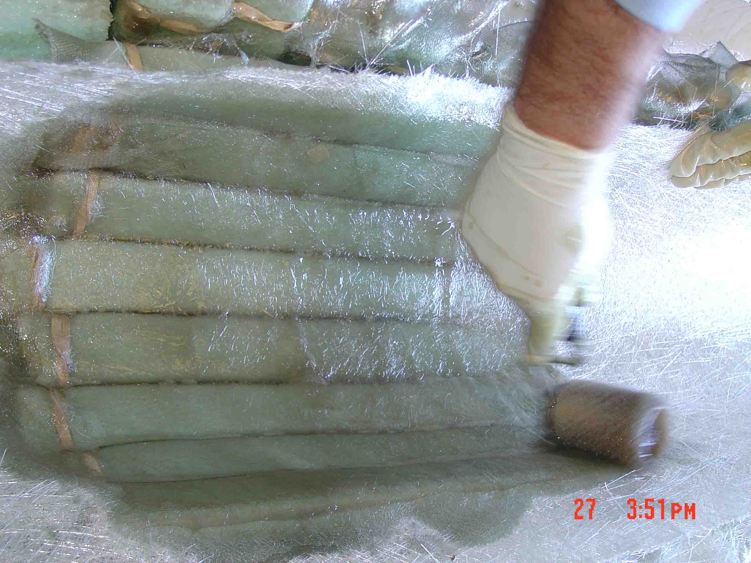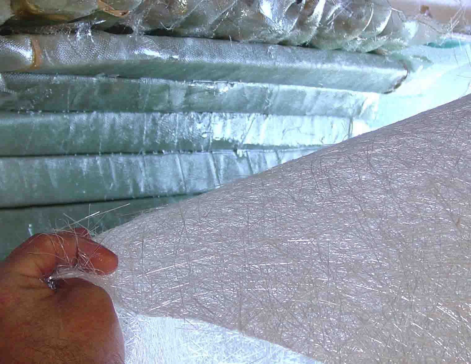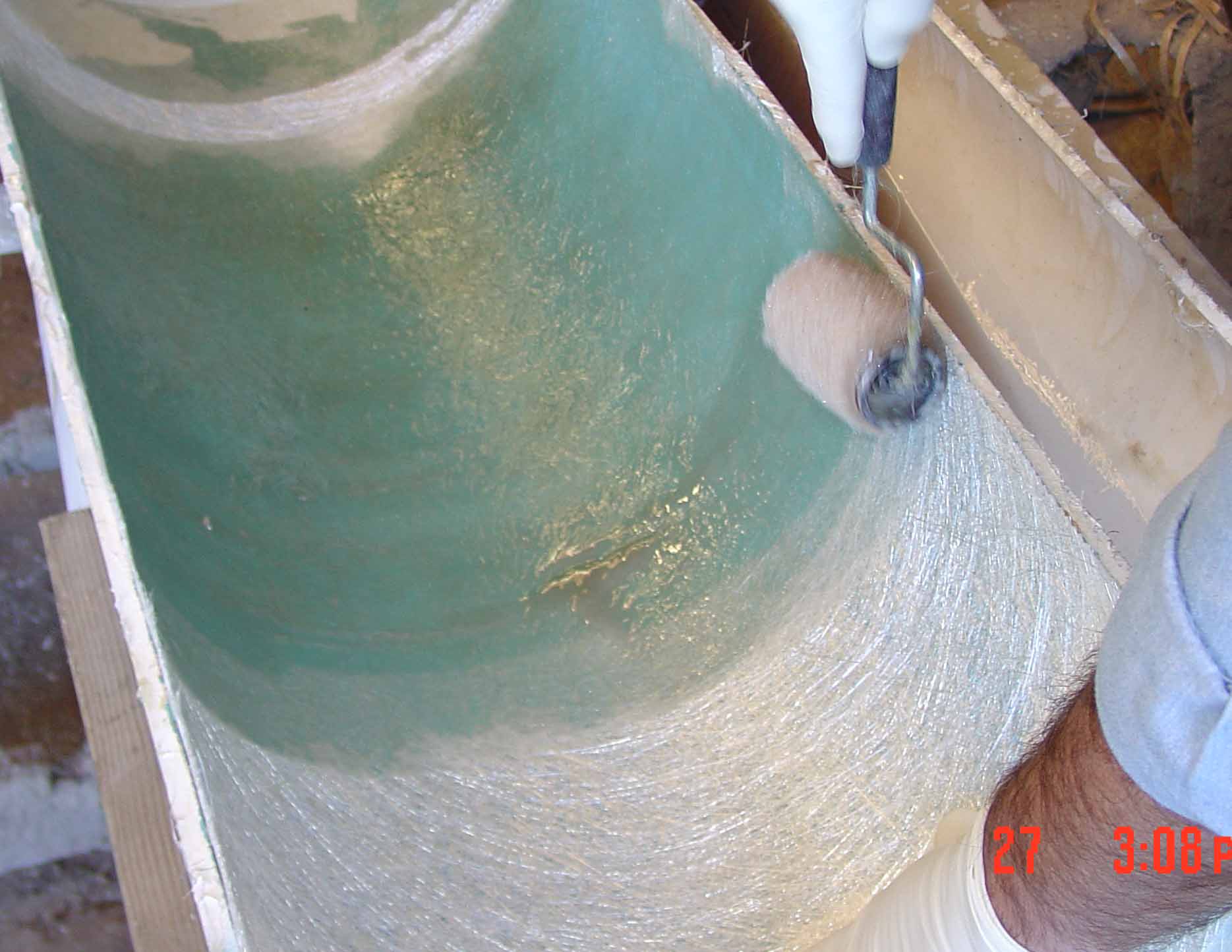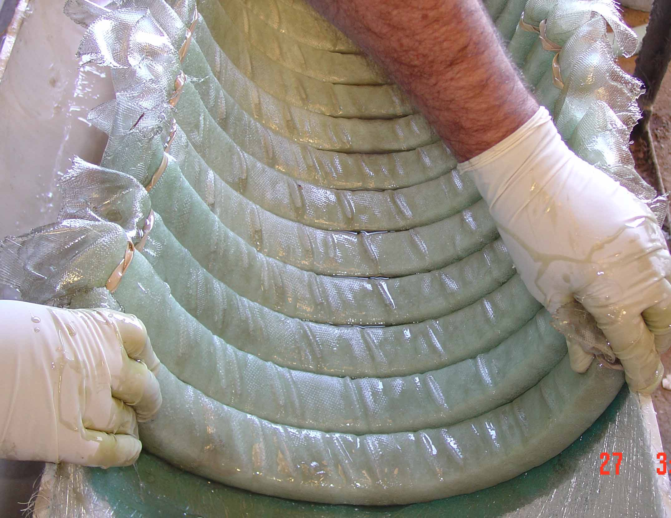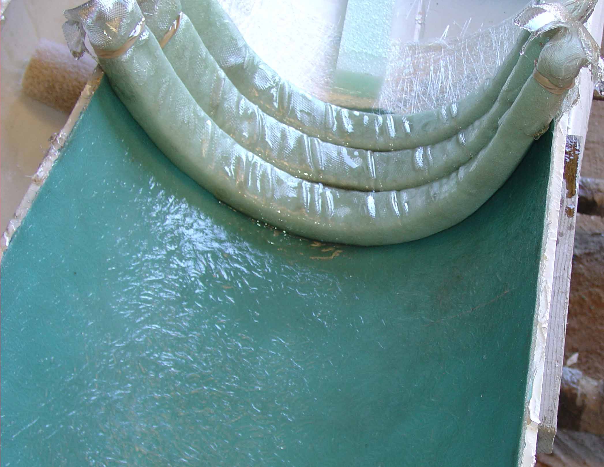 The Matrix geometry process begins with a layer of fiber that is placed in the bottom of a mold. This layer forms the lower outer layer of the Matrix structure that is being constructed. In boat building a layer of gel-coat would be sprayed into the mold before the fiber is applied. |