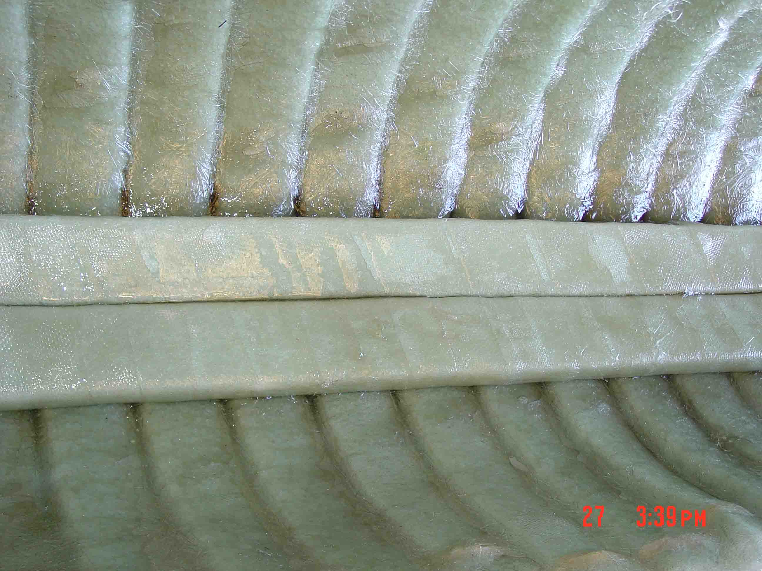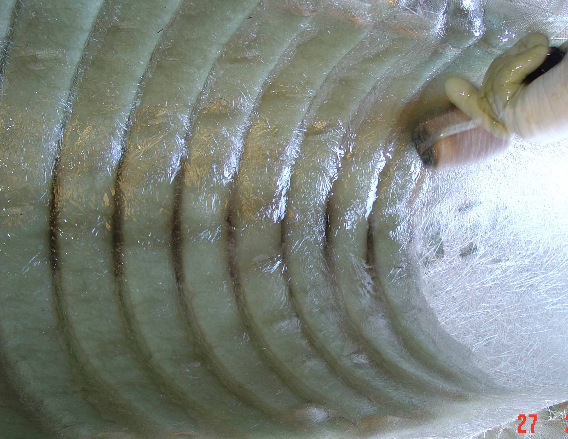 | Over the Y-Axis lower plane, a center bonding layer, which is a flat sheet of composite fabric, is laid over the ribs. Resin is applied to this center bonding layer and the center bonding layer forms a center wall within the Matrix geometry that serves the important purpose of bonding all of the individual sections of Flexi-Beam together. As the next step takes place, this bonding layer will also bond together all of the X-Axis Flexi-beam sections that are laid over this center bonding layer as you will see. | ![]() |