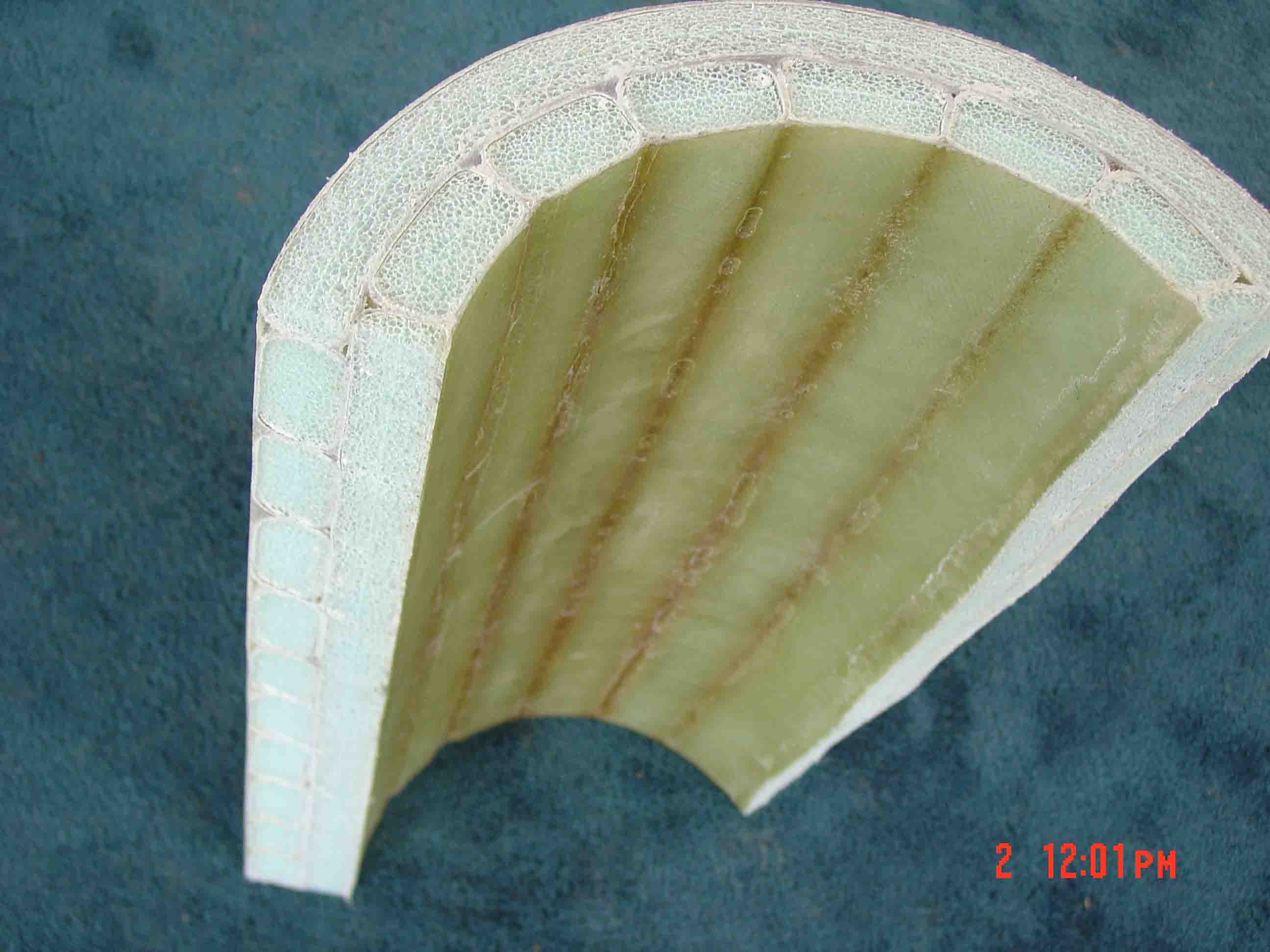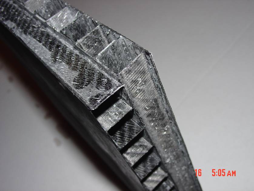 An incredibly strong three hull boat with internal floatation and insulation is created by use of the Matrix as shown is this detail. The Matrix geometry produces so much strength that conventional ribs and stringers are not needed. Within the fiber walls of the Matrix is sealed cell foam core that provides Coast Guard approved floatation and excellent insulation capability. |